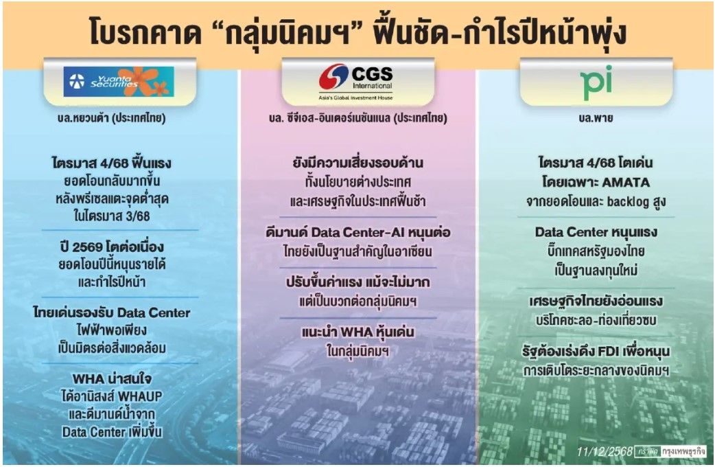 “กลุ่มนิคมฯ” แนวโน้มธุรกิจฟื้นตัวขานรับดีมานด์ “ดาต้า เซนเตอร์” และ “สงครามการค้าคลี่คลาย” รับไตรมาส 4/68 เข้าไฮซีชัน “บล.หยวนต้า” ชี้ปีหน้า “กำไร-รายได้” ดีขึ้น “บล. ซีจีเอส-อินเตอร์เนชันแนล” มองแม้ “ความเสี่ยง” ยังอยู่ แต่การลงทุนเทคโนโลยีชั้นสูงยังต่อเนื่อง “บล.พาย” ชี้รัฐควรส่งเสริมลงทุน โดยเฉพาะการดึงดูด “เอฟดีไอ” หนุนกลุ่มนิคมฯ เติบโตระยะกลาง