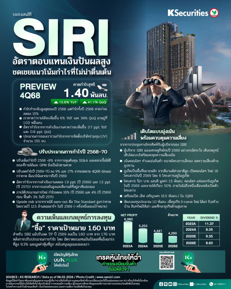 จากการประชุมทางโทรศัพท์กับผู้บริหารของ SIRI บริษัทฯ มีมุมมองระมัดระวังต่อการเติบโตทางเศรษฐกิจของไทยในปี 2569 ส่งผลให้กลยุทธ์หลักของ SIRI จะเป็นการเติบโตแบบมุ่งเน้น พร้อมการควบคุมความเสี่ยงอย่างเข้มงวด โดยจะเน้นพัฒนาโครงการคอนโดฯ ในทำเลที่มีการแข่งขันต่ำและขนาดโครงการเล็กลง ขณะเดียวกัน พื้นที่ที่มีอุปสงค์จากชาวต่างชาติสูง เช่น ภูเก็ต จะเป็นพื้นที่ขยายธุรกิจสำคัญในปี 2569 จากแผนเปิดโครงการคอนโดฯ ใหม่ทั้งหมด 16 โครงการ จะมี 6 โครงการตั้งอยู่ในภูเก็ต โดยโครงการ รีอา บาย แสนสิ มูลค่า 1.5 พันลบ. จะเป็นคอนโดฯ แห่งแรกของบริษัทในภูเก็ตในปี 2569 และสามารถขายได้เกือบ 50% ภายในไม่ถึงหนึ่งเดือนหลังเปิดตัว นอกจากนี้ โครงการ เลิฟ เจริญนคร (6.5 พันลบ.) มีแผนเปิดตัวในไตรมาส 1/2569 อีกทั้ง SIRI จะจัดสรรงบลงทุนราว 1.0 พันลบ. เพื่อพัฒนาธุรกิจ S-curve ใหม่ ๆ ได้แก่ ธุรกิจรับสร้างบ้านและสินทรัพย์เพื่อการเช่า รวมถึงอยู่ระหว่างศึกษาธุรกิจที่เกี่ยวข้องกับสุขภาพ