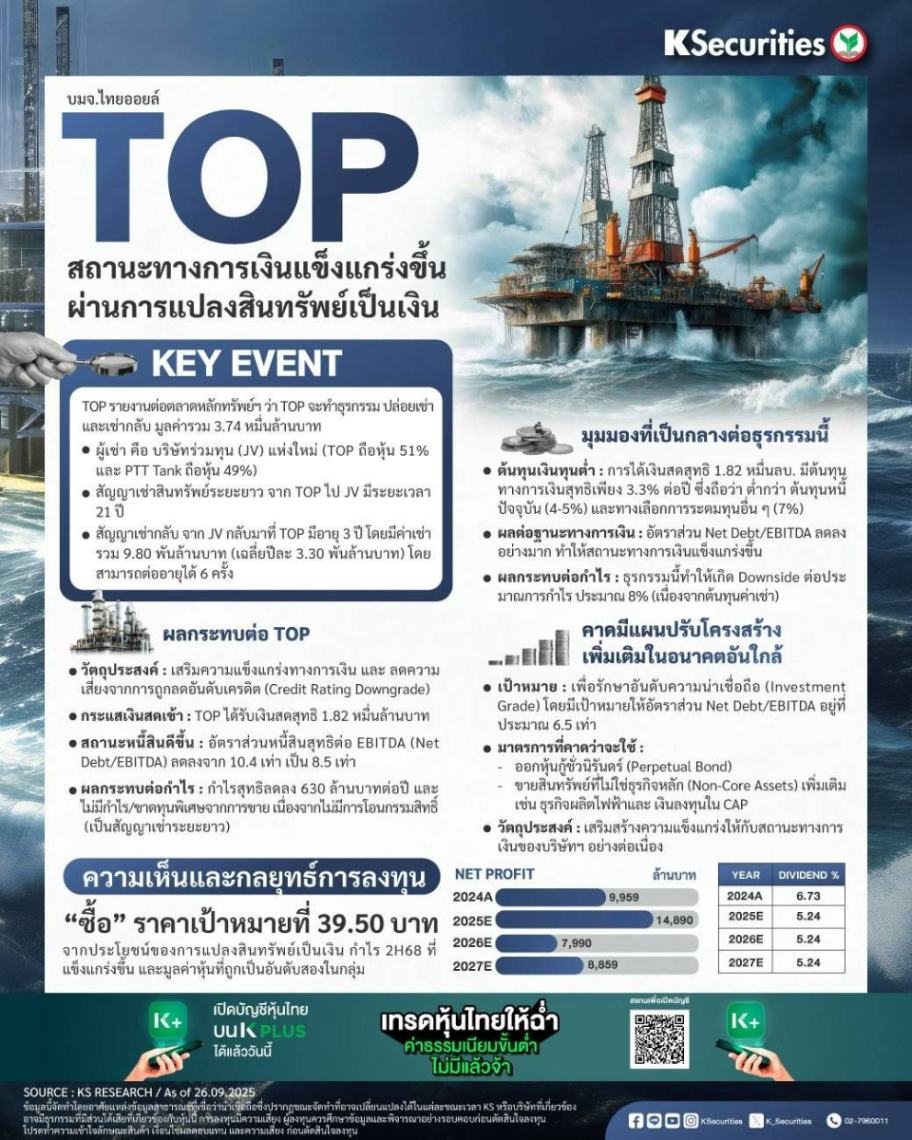 รายละเอียดของการแปลงสินทรัพย์เป็นเงินของ TOP TOP รายงานต่อตลาดหลักทรัพย์ฯ ว่า TOP จะเข้าทำสัญญาปล่อยเช่าสินทรัพย์ระยะยาวและสัญญาเช่ากลับ (leaseback) เป็นระยะเวลา 21 ปี กับบริษัทร่วมทุน (JV) แห่งใหม่ (TOP ถือหุ้น 51% และ PTT Tank ถือหุ้น 49%) สำหรับสินทรัพย์โครงสร้างพื้นฐานของ TOP (ได้แก่ ถังเก็บน้ำมันดิบ ทุ่นรับน้ำมันดิบกลางทะเล หรือ SBM สถานีขนถ่ายน้ำมัน และที่ดิน) มูลค่ารวมของสินทรัพย์ที่ปล่อยเช่าระยะยาวดังกล่าวจะอยู่ที่ 3.74 หมื่นลบ. ขณะที่ TOP จะเช่าสินทรัพย์ดังกล่าวกลับโดยมีสัญญาเช่าอายุ 3 ปี โดยมีค่าเช่า 9.80 พันลบ. (ค่าเช่าเฉลี่ยต่อปี 3.30 พันลบ.) ซึ่งจะต่ออายุโดยอัตโนมัติหากไม่มีการแจ้งยกเลิก รายการนี้ถือเป็นรายการที่เกี่ยวโยงกัน ซึ่งต้องได้รับการอนุมัติจากที่ประชุมวิสามัญผู้ถือหุ้นในวันที่ 9 ธ.ค.2568 โดยธุรกรรมนี้คาดว่าจะแล้วเสร็จภายในปี 2568