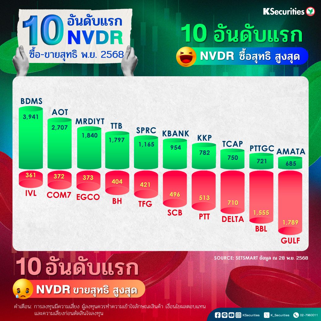10 อันดับแรก NVDR ที่มีมูลค่าซื้อ/ขายสุทธิสูงสุด ในเดือน พ.ย. 2568