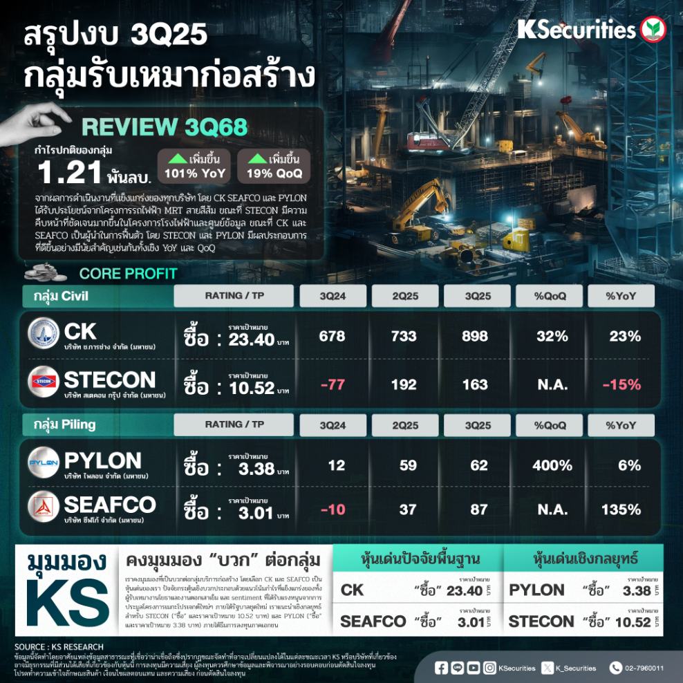 สรุปผลประกอบการไตรมาส 3/2568 บริษัทรับเหมาทั้ง 2 รายที่เราวิเคราะห์อยู่ ได้แก่ CK STECON, SEAFCO และ PYLON รายงานกำไรปกติรวมไตรมาส 3/2568 ที่ 1.21 พันลบ. (+101% YoY และ +19% QoQ) สูงกว่าที่เราคาดการณ์ไว้ 10% ผลประกอบการที่ดีขึ้นดังกล่าวมาจากผลการดำเนินงานที่แข็งแกร่งของทุกบริษัท โดย CK SEAFCO และ PYLON ได้รับประโยชน์จากโครงการรถไฟฟ้า MRT สายสีส้ม ขณะที่ STECON มีความคืบหน้าที่ชัดเจนมากขึ้นในโครงการโรงไฟฟ้าและศูนย์ข้อมูล ขณะที่ CK และ SEAFCO เป็นผู้นำในการฟื้นตัว โดย STECON และ PYLON มีผลประกอบการที่ดีขึ้นอย่างมีนัยสำคัญเช่นกันทั้งเชิง YoY และ QoQ