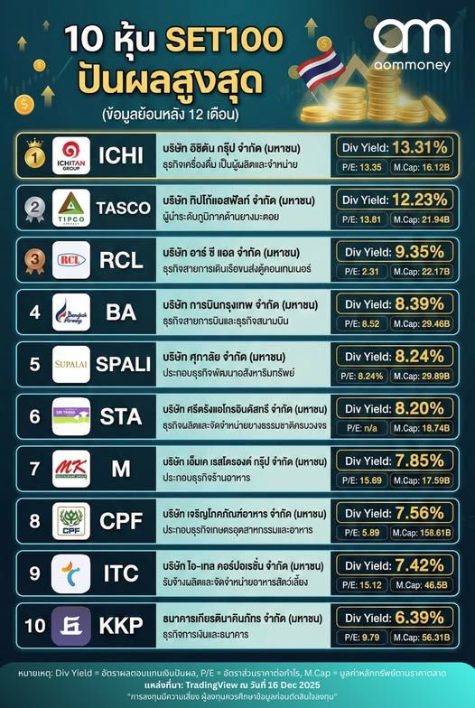 10 หุ้น SET100 ปันผลสูงสุด (ย้อนหลัง 12 เดือน)