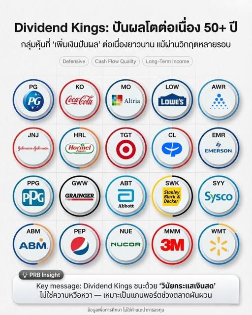 การที่รายชื่อมันหลากหลาย แปลว่า “Dividend Kings ไม่ได้มีสูตรเดียว” แต่สิ่งที่เหมือนกันคือ วินัยเงินสดและความสามารถฝ่าวิกฤตได้หลายรอบ