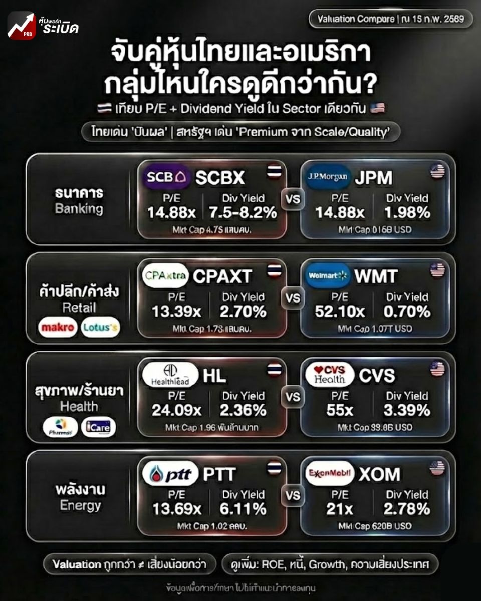 ภาพนี้ตั้งใจให้เห็นว่า หุ้นไทยมักชนะในมุม “ปันผล + ราคาจับต้องได้” ขณะที่หุ้นสหรัฐฯ มักชนะในมุม “Premium จาก Scale/Quality” เพราะกำไรเสถียรกว่าและมีอำนาจในระบบนิเวศของตัวเองมากกว่า ดังนั้นแก่นจริงไม่ใช่เลือกฝั่งไหน แต่คืออ่านให้ขาดว่า “พรีเมียม” หรือ “ปันผล” ที่เราเห็นนั้น ยั่งยืนแค่ไหนในงบที่กำลังจะออก