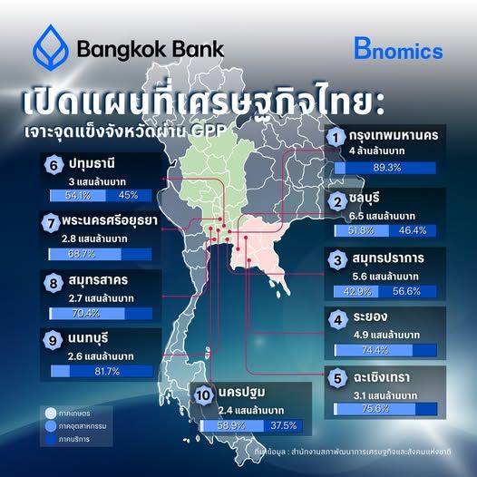 ข้อมูลปี 2023 จากสภาพัฒน์ระบุว่า เพียง 10 จังหวัด สร้างมูลค่าทางเศรษฐกิจรวมกันประมาณ 67% ของ GPP ทั้งประเทศ กรุงเทพมหานครเพียงจังหวัดเดียวมีมูลค่ากว่า 4 ล้านล้านบาท