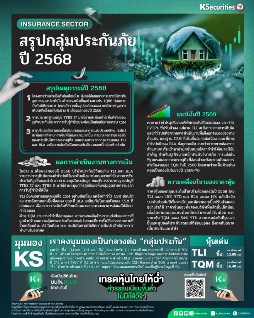 แนะนำ “ซื้อ” TLI และ TQM และ “ถือ” BLA สำหรับ TLI ราคาเป้าหมายของเราที่ 13.8บาท (P/EV ที่ 0.8 เท่า) สะท้อนฐานะทางการเงินที่แข็งแกร่ง สถานะ CSM ที่อยู่ในระดับสูง และการเติบโตอย่างต่อเนื่องหนุนจากช่องทางตัวแทนที่มีประสิทธิภาพ แม้เราคงมุมมองเป็นกลางต่อกลุ่มประกันชีวิตโดยรวม จากการเติบโตของเบี้ยประกันที่อยู่ในระดับต่ำและการขาดปัจจัยบวกระยะสั้น