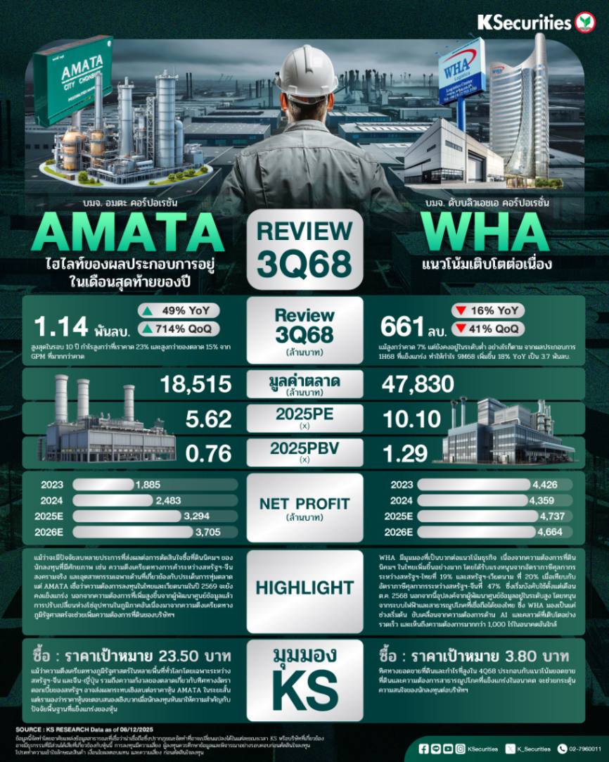 คงคำแนะนำ “ซื้อ” AMATA และ TP ที่ 23.5 บาท ยอดขายที่ดินและกำไรที่คาดปรับตัวดีขึ้นอย่างมากในไตรมาส 4/68 ราคาหุ้นที่ไม่แพงและ DY ที่สูงเกิน 6% หนุนคำแนะนำของเรา