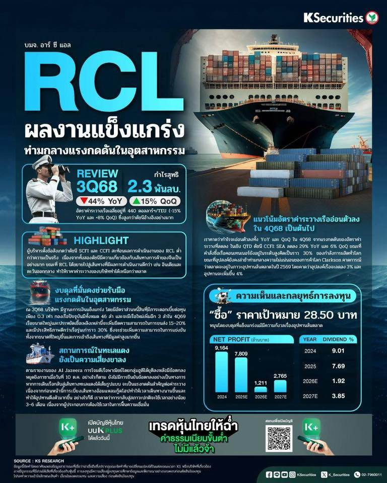 มุมมอง KS : คงคำแนะนำ “ซื้อ” ด้วยราคาเป้าหมาย 28.5 บาท ราคาเป้าหมายของเราพิจารณาจาก PBV ทวีคูณ 0.42 เท่า คิดเป็นมูลค่าตามบัญชีต่อหุ้น (BVPS) ที่ 67.8 บาท เราคงคำแนะนำ “ซื้อ” เนื่องจากราคาเป้าหมายคิดเป็นอัตราผลตอบแทนผู้ถือหุ้นรวม 14% แม้กำไรไตรมาส 3/2568 จะออกมาแข็งแกร่ง แต่ราคาหุ้น RCL ยังไม่ตอบสนอง สะท้อนความกังวลของนักลงทุนต่อความเสี่ยงอุปทานล้นตลาด อย่างไรก็ตาม เราเชื่อว่าฐานะการเงินที่มั่นคงและความสามารถในการแข่งขันที่เพิ่มขึ้นจะช่วยให้บริษัทฯ สามารถรับมือกับแนวโน้มที่ท้าทายได้
