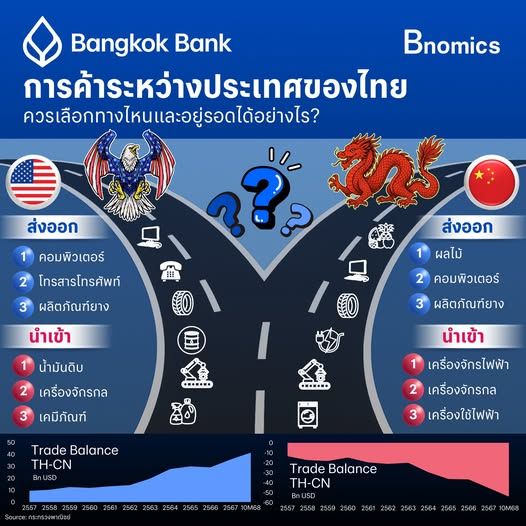 สงครามการค้า ความตึงเครียดทางภูมิรัฐศาสตร์ และการแบ่งขั้วของห่วงโซ่อุปทาน ทำให้ประเทศขนาดกลางอย่างไทยต้องคิดมากกว่าเดิม 10 เดือนแรกของปี 2568 ไทยยังคงเกินดุลการค้ากับสหรัฐฯ มากถึง 41,333 ล้านดอลลาร์สหรัฐฯ ส่วนหนึ่งเพราะส่งออกสินค้าขั้นปลายที่มีมูลค่าเพิ่มสูงกว่า ขณะที่ขาดดุลการค้ากับจีน 53,987 ล้านดอลลาร์สหรัฐฯ เพราะนำเข้าสินค้าขั้นกลางและวัตถุดิบจำนวนมาก สะท้อนบทบาทที่แตกต่างของสองตลาด สหรัฐฯ คือปลายทางสินค้ามูลค่าเพิ่มสูง ส่วนจีนคือฐานการผลิตและแหล่งนำเข้าสำคัญของไทย