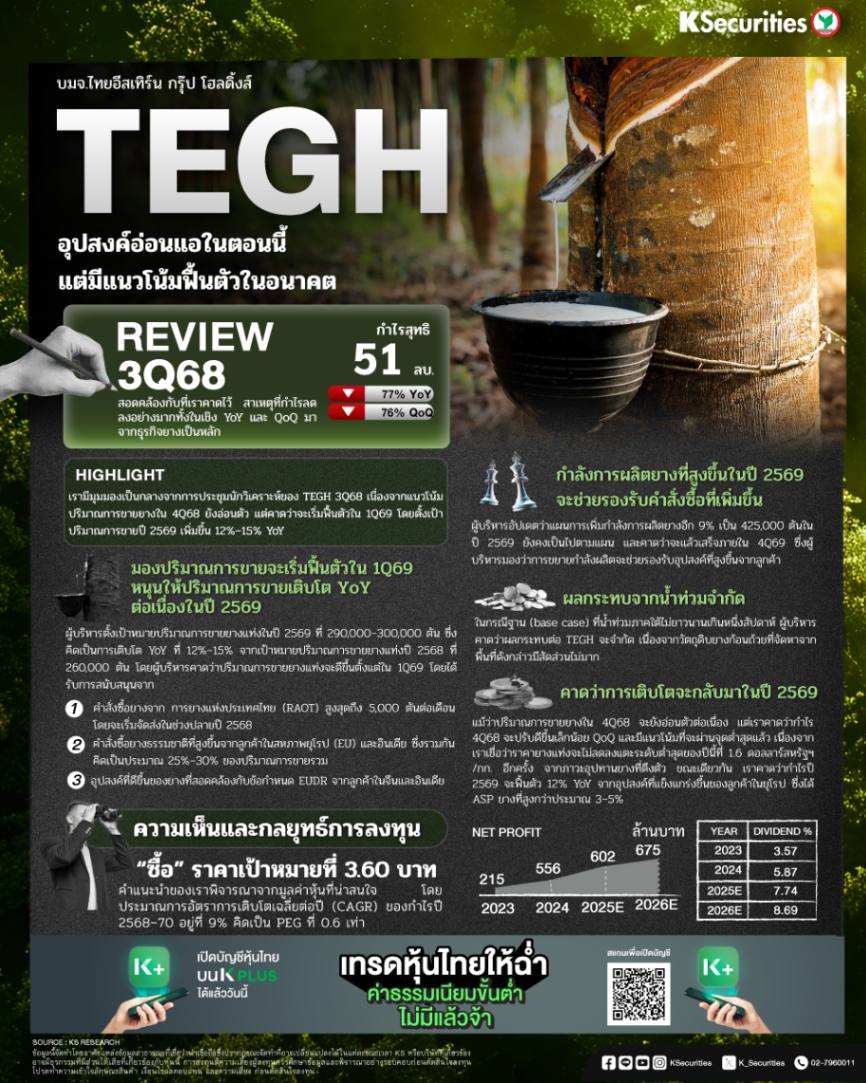 มุมมองเป็นกลางจากการประชุมนักวิเคราะห์ของ TEGH ไตรมาส 3/68 เนื่องจากแนวโน้มปริมาณการขายยางในไตรมาส 4/68 ยังอ่อนตัว แต่คาดว่าจะเริ่มฟื้นตัวในไตรมาส 1/69 โดยตั้งเป้าปริมาณการขายปี 2569 เพิ่มขึ้น 12%–15% YoY