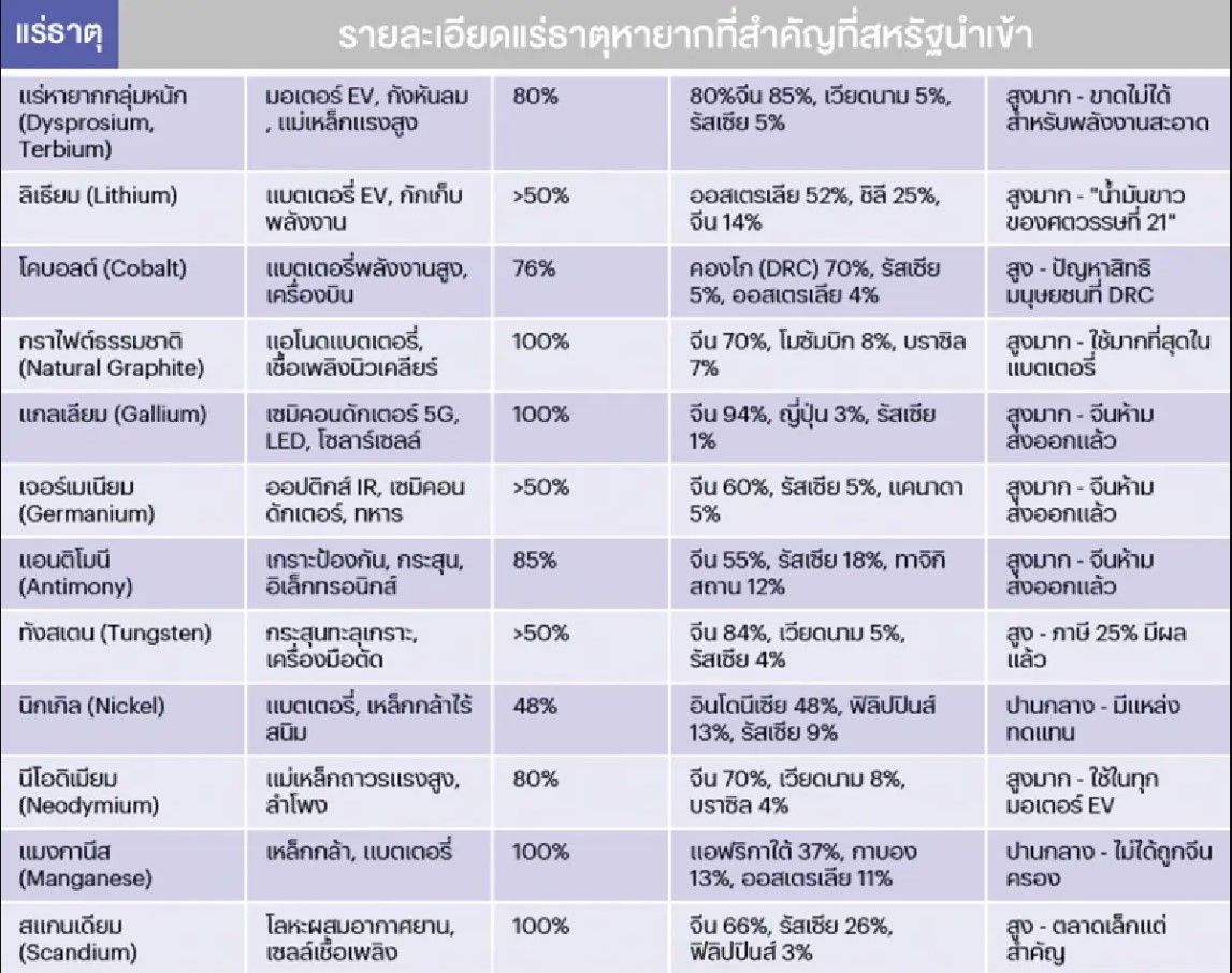 แร่ธาตุหายาก (Critical Minerals) เป็น “วิตามิน” ของเทคโนโลยีสมัยใหม่ ใช้ในปริมาณเล็กน้อยแต่ขาดไม่ได้ แม่เหล็กแรงสูงที่ทำจากนีโอดิเมียมและดิสโพรเซียมใช้เพียง 1-2 กิโลกรัมต่อมอเตอร์รถยนต์ไฟฟ้า แต่หากไม่มีจะทำให้มอเตอร์หนักขึ้น 3-5 เท่า แกลเลียมและเจอร์เมเนียมใช้ในเซมิคอนดักเตอร์ความเร็วสูงและระบบเรดาร์ทหาร กราไฟต์ใช้ในแบตเตอรี่ถึง 50-100 กิโลกรัมต่อคัน