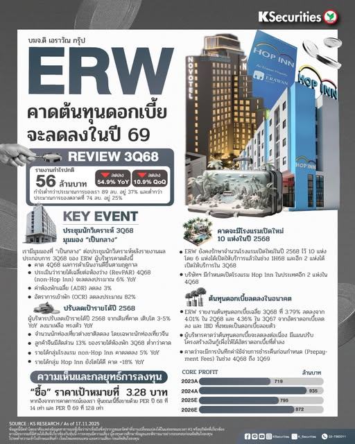 ผู้บริหารปรับลดเป้ารายได้ปี 2568 จากเดิมที่เติบโต 3-5% YoY เหลือทรงตัว YoY สะท้อนถึงจำนวนนักท่องเที่ยวต่างชาติที่ลดลง โดยเฉพาะชาวจีน ซึ่งเป็นหนึ่งในลูกค้าหลักของ ERW (คิดเป็น 13% ของรายได้ห้องพักไตรมาส 3/2568) ต่ำกว่าที่คาดการณ์ไว้ อย่างไรก็ตาม เป้ารายได้ของผู้บริหารที่ลดลงส่วนใหญ่มาจากกลุ่มโรงแรมnon-Hop Inn ซึ่งคาดรายได้จะลดลง 5% YoY ขณะที่ผู้บริหารคาดว่ารายได้ของกลุ่มธุรกิจโรงแรมราคาประหยัด (Hop Inns) จะอยู่ที่ 18% YoY