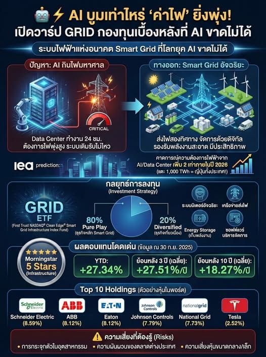 ถ้าคุณกำลังมองหาการลงทุนที่เกาะกระแสโลกอนาคต ที่พลังงานไฟฟ้าจะกลายเป็นหัวใจสำคัญของทุกสรรพสิ่ง และอยากกระจายความเสี่ยงออกจากหุ้น AI ตรงๆ นิคกี้ว่ากองทุน GRID นี้ถือเป็นตัวเลือกที่น่าจับตามองมากๆ ค่ะ เพราะไม่ใช่แค่ลงทุนในโรงไฟฟ้าเดิมๆ แต่ลงทุนใน "มันสมองและเส้นเลือด" ของระบบพลังงานยุคใหม่ทั้งหมดค่ะ