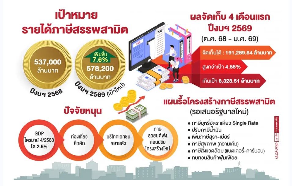 โดยปัจจัยบวกสำคัญที่ผลักดันตัวเลขให้สูงกว่าคาดการณ์ เกิดจากเศรษฐกิจในไตรมาส 4 ปี 2568 ที่ขยายตัวถึง 2.5% โดยเฉพาะการขยายตัวของภาคการบริโภคที่ส่งผลต่อเนื่องมายังผลการจัดเก็บภาษีสินค้าฟุ่มเฟือย รวมทั้งแรงส่งจากการท่องเที่ยวช่วงปลายปีและเทศกาลปีใหม่