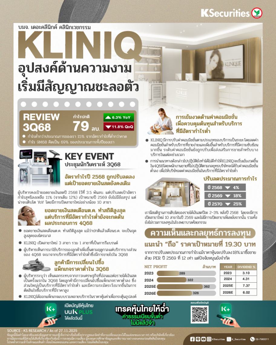 มุมมอง KS : ปรับลดคำแนะนำเป็น “ถือ” จาก “ซื้อ” ภาวะเศรษฐกิจที่อ่อนลงเริ่มกดดันอุปสงค์ด้านความงาม โดย KLINIQ จะต้องเผชิญแรงกดดันต่ออัตรากำไรอย่างต่อเนื่องจากสัดส่วนบริการที่มีอัตรากำไรต่ำที่เพิ่มขึ้น แม้กำไรไตรมาส 4/2568 มีแนวโน้มเติบโต YoY แต่เราเห็นว่าเป็นปัจจัยบวกในระยะสั้น