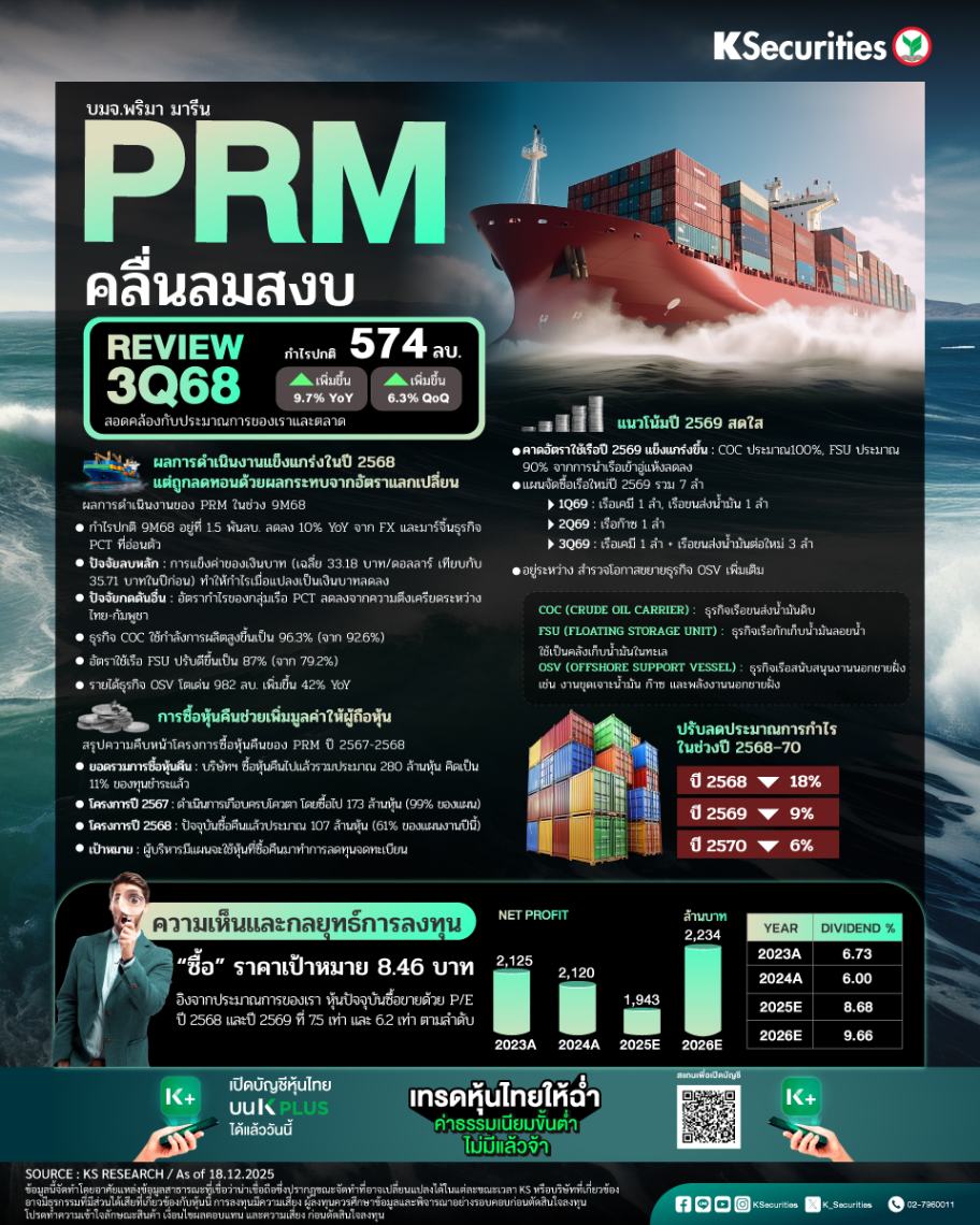 บริษัทฯ รายงานผลการดำเนินงานที่แข็งแกร่งในช่วง 9M68 แต่ผลประกอบการได้รับผลกระทบบางส่วนจากผลกระทบของอัตราแลกเปลี่ยน เนื่องจากอัตราแลกเปลี่ยนเฉลี่ยในสกุลบาทต่อดอลลาร์สหรัฐฯ ในช่วง 9M68 อยู่ที่ 33.18 บาท เมื่อเทียบกับ 35.71 บาทในช่วง 9M67 PRM รายงานกำไรปกติช่วง 9M68 ที่ 1.5 พันลบ. ซึ่งลดลง 10% YoY โดยมีสาเหตุหลักมาจากการแข็งค่าของเงินบาทเมื่อเทียบกับดอลลาร์สหรัฐฯ และอัตรากำไรจากการดำเนินงานที่ลดลงในธุรกิจเรือขนส่งน้ำมันและสารเคมี (PCT) ซึ่งส่วนหนึ่งได้รับแรงกดดันจากความตึงเครียดระหว่างประเทศไทยและกัมพูชา