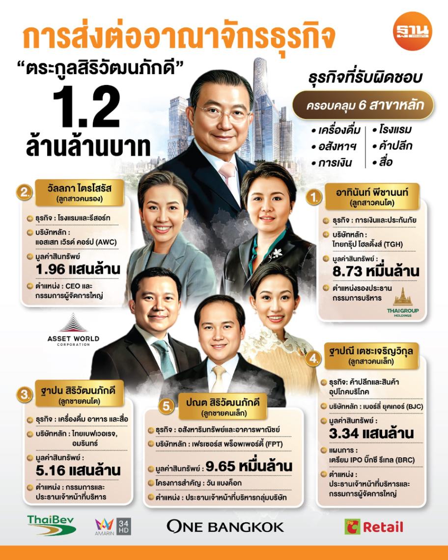 ทายาททั้ง 5 คนได้รับมอบหมายบทบาทชัดเจนในการบริหารธุรกิจครอบครัวที่ครอบคลุมหลายกลุ่มอุตสาหกรรม ไม่ว่าจะเป็นธุรกิจการเงินและประกันภัยที่มีผลประกอบการเติบโตต่อเนื่อง ธุรกิจโรงแรมและมิกซ์ยูสที่มีแผนลงทุนมูลค่าหลายแสนล้านบาท รวมถึงธุรกิจเครื่องดื่ม อาหาร ค้าปลีก และอสังหาริมทรัพย์ที่ขยายพอร์ตโฟลิโออย่างแข็งแกร่ง