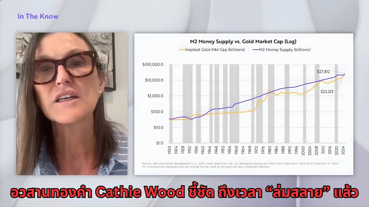 Cathie Wood กำลังบอกว่า "และในตอนนี้ เราอยู่ที่จุดนั้นอีกครั้ง" โดยเธอกล่าวว่า มูลค่าตลาดของทองคำในปัจจุบัน ไม่เพียงแค่แตะระดับ M2 เท่านั้น แต่ยัง "ทะลุผ่าน" ขึ้นไปแล้ว ซึ่งเป็นภาพที่คล้ายคลึงกับจุดสูงสุดในปี 1981 อย่างมาก