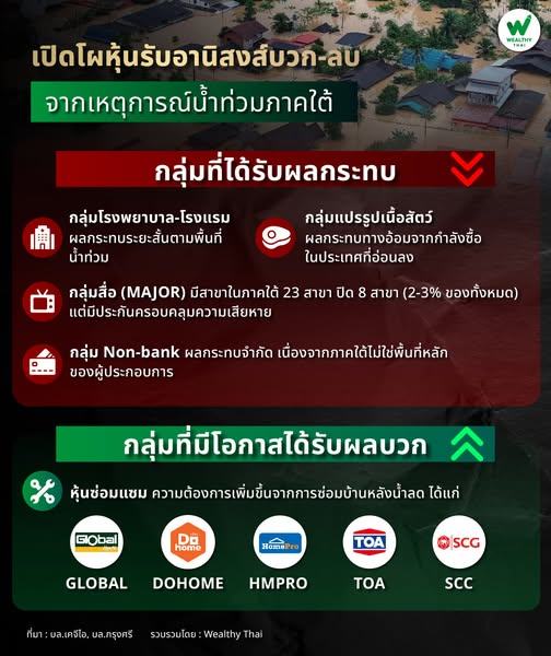 โดย บริษัทหลักทรัพย์ เคจีไอ (ประเทศไทย) จำกัด (มหาชน) ระบุ เหตุการณ์น้ำท่วมภาคใต้ของประเทศไทยรอบนี้ โดยเฉพาะในพื้นที่หาดใหญ่ มองว่ากลุ่มโรงพยาบาลและโรงแรมจะได้รับผลกระทบในระยะสั้น ส่วนกลุ่ม commerce และหุ้นสื่อบางตัวอย่าเช่น MAJOR จะได้รับผลกระทบไม่มากนัก ในขณะเดียวกัน กลุ่มแปรรูปเนื้อสัตว์อาจจะถูกกระทบทางอ้อมจากกำลังซื้อที่แผ่วลง