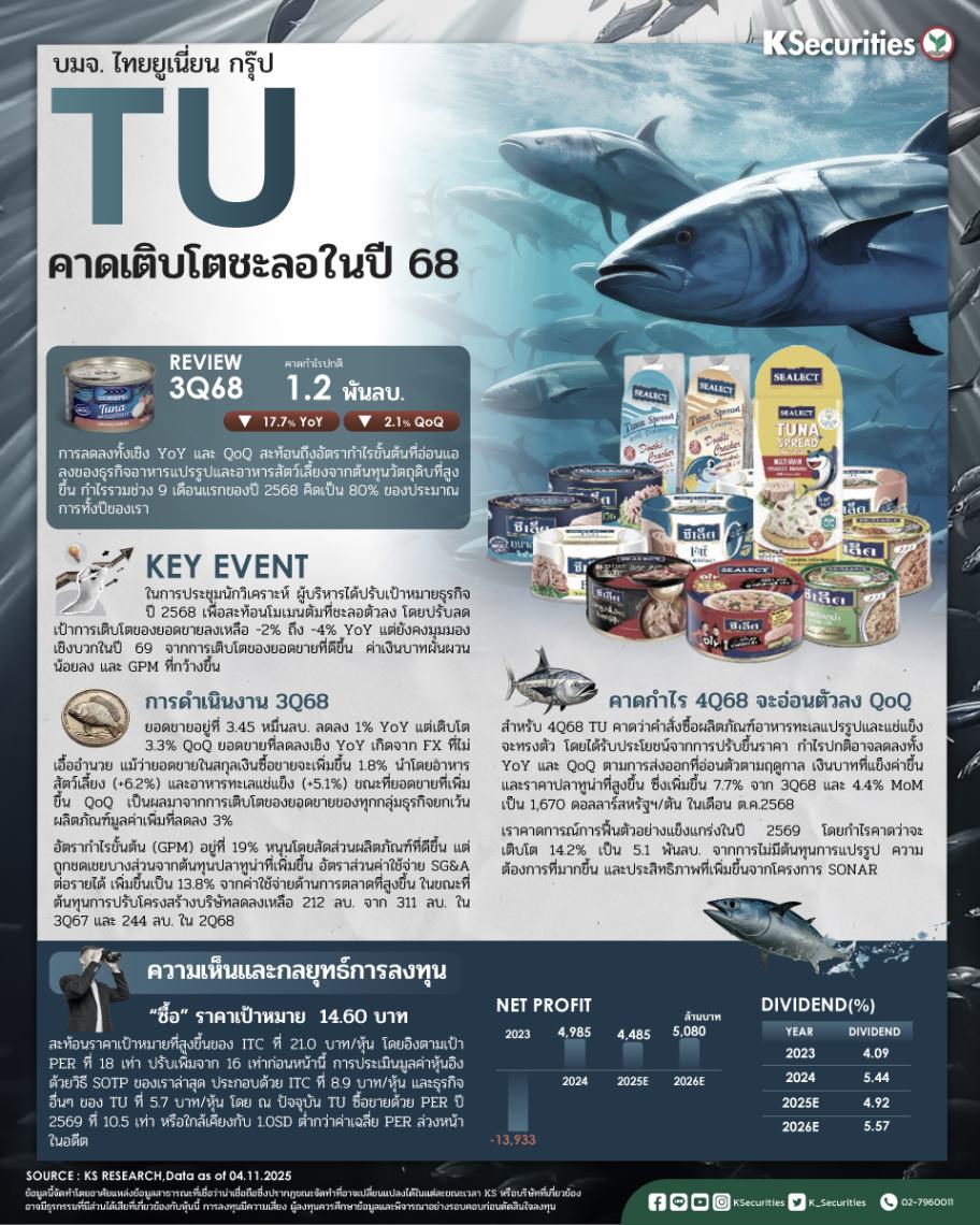 สำหรับไตรมาส 4/2568 TU คาดว่าคำสั่งซื้อผลิตภัณฑ์อาหารทะเลแปรรูปและแช่แข็งจะทรงตัว โดยได้รับประโยชน์จากการปรับขึ้นราคา กำไรปกติอาจลดลงทั้ง YoY และ QoQ ตามการส่งออกที่อ่อนตัวตามฤดูกาล เงินบาทที่แข็งค่าขึ้น และราคาปลาทูน่าที่สูงขึ้น ซึ่งเพิ่มขึ้น 7.7% จากไตรมาส 3/2568 และ 4.4% MoM เป็น 1,670 ดอลลาร์สหรัฐฯ/ตัน ในเดือน ต.ค.2568