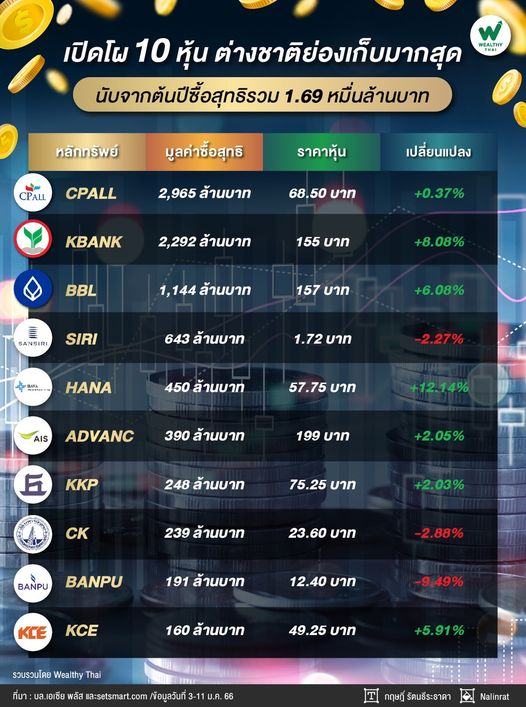 นอกจากนี้ยังมองว่า Fund Flow ยังมีโมเมนตั้มไหลเข้าตลาดหุ้นไทยต่อ และยังมีโอกาสได้กำไรจากอัตราแลกเปลี่ยนเพิ่มเติม ตามค่าเงินบาทที่มีแนวโน้มแข็งค่า กลยุทธ์ฝ่ายวิจัยฯ ทำการคัดกรองหุ้นที่ต่างชาติซื้อสะสมเด่นในปีนี้ เพื่อคาดหวัง Momentum ที่จะซื้อสะสมต่อเนื่องได้ผลลัพธ์ 10 หุ้นที่ต่างชาติซื้อสะสมทางตรงมากสุดในช่วงตั้งแต่ต้นปีถึงปัจจุบัน (ณ วันที่ 3–10 ม.ค. 66) มีดังนี้