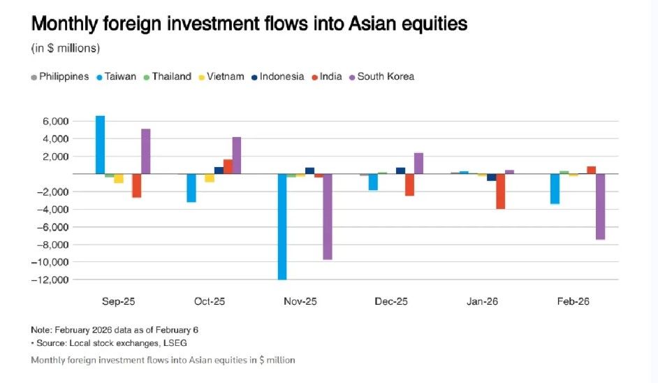 ข้อมูลจาก LSEG ระบุว่า ในสัปดาห์สิ้นสุดวันที่ 6 ก.พ. นักลงทุนต่างชาติขายสุทธิหุ้นใน 7 ตลาดเอเชียประกอบด้วย เกาหลีใต้ ไต้หวัน ไทย อินเดีย อินโดนีเซีย เวียดนาม และฟิลิปปินส์ รวม 9,790 ล้านดอลลาร์ หรือเพิ่มขึ้นเป็นสองเท่าเมื่อเทียบกับยอดขายสุทธิทั้งเดือนมกราคมที่ราว 3,900 ล้านดอลลาร์