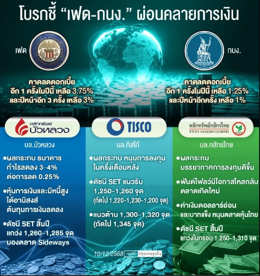 - นักวิเคราะห์คาดการณ์ว่าธนาคารกลางสหรัฐ (เฟด) และคณะกรรมการนโยบายการเงิน (กนง.) มีแนวโน้มปรับลดอัตราดอกเบี้ยนโยบายในการประชุมครั้งถัดไป