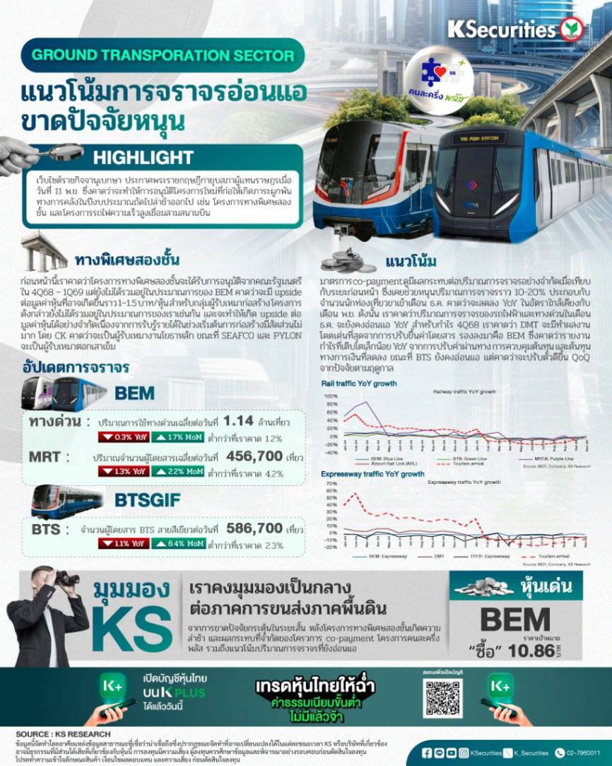 มุมมอง KS : มุมมองกลาง เราปรับลดมุมมองต่อกลุ่มขนส่งภาคพื้นดินจาก “มุมมองบวก” เป็น “เป็นกลาง” จากการขาดปัจจัยกระตุ้นในระยะสั้น หลังโครงการทางพิเศษสองชั้นเกิดความล่าช้า และผลกระทบที่จำกัดของโครวการ co-payment โครงการคนละครึ่งพลัส รวมถึงแนวโน้มปริมาณการจราจรที่ยังอ่อนแอ อย่างไรก็ดี กลุ่มธุรกิจนี้ยังมีความทนทานต่อภาวะเศรษฐกิจชะลอตัว และยังอาจมี upside จากจำนวนนักท่องเที่ยวขาเข้าที่สูงกว่าคาด โดย BEM ยังคงเป็นหุ้นเด่นของเรา เนื่องจากมี downside จำกัด