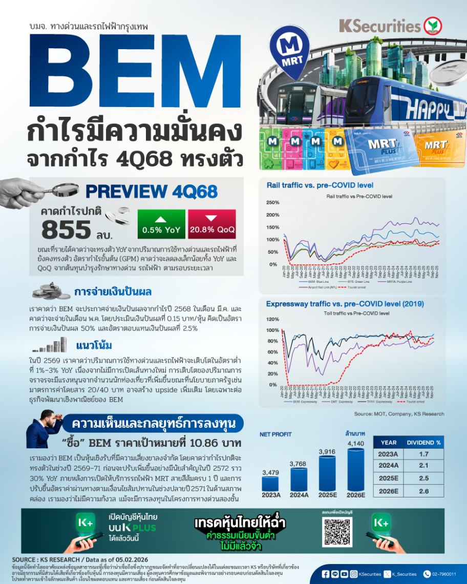 พรีวิวไตรมาส 4/2568 BEM มีกำหนดประกาศงบการเงินไตรมาส 4/2568 ในวันที่ 25 ก.พ. เราคาดว่าบริษัทฯ จะรายงานกำไรปกติที่ 855 ลบ. (+0.5% YoY, -20.8% QoQ) ขณะที่รายได้คาดว่าจะทรงตัว YoY จากปริมาณการใช้ทางด่วนและรถไฟฟ้าที่ยังคงทรงตัว อัตรากำไรขั้นต้น (GPM) คาดว่าจะลดลงเล็กน้อยทั้ง YoY และ QoQ จากต้นทุนบำรุงรักษาทางด่วน รถไฟฟ้า ตามรอบระยะเวลา และการเพิ่มการลงทุนด้านสื่อในธุรกิจพัฒนาเชิงพาณิชย์ ทั้งนี้ กำไรปกติ 12M68 คิดเป็น 97% ของประมาณการกำไรทั้งปี 2568 เดิมของเรา