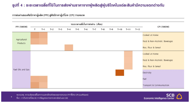 จากการศึกษา EIC พบว่าดัชนีราคาผู้ผลิตมีความสัมพันธ์กับดัชนีราคาผู้บริโภคเชิงบวกและมีผลส่งผ่านช่วงเงินเฟ้อมากกว่าช่วงเงินฝืด โดยหากดัชนีราคาผู้บริโภคมีการเปลี่ยนแปลงเพิ่มขึ้น ผลกระทบของดัชนีราคาผู้ผลิตต่อดัชนีราคาผู้บริโภคจะมากกว่าในกรณีดัชนีราคาผู้บริโภคมีการเปลี่ยนแปลงลดลงกล่าวคือ เมื่อต้นทุนเพิ่มขึ้นราคาสินค้ามีแนวโน้มเพิ่มสูงขึ้นแต่หากต้นทุนผู้ผลิตลดลง ราคาสินค้าจะมีแนวโน้มลดลงช้ากว่า ทำให้ในระยะข้างหน้าถึงแม้สถานการณ์ราคาพลังงานและต้นทุนผู้ผลิตเริ่มคลี่คลาย ราคาที่ผู้บริโภคต้องจ่ายคงจะไม่ได้ลดลงเร็วตาม (รูปที่ 6)