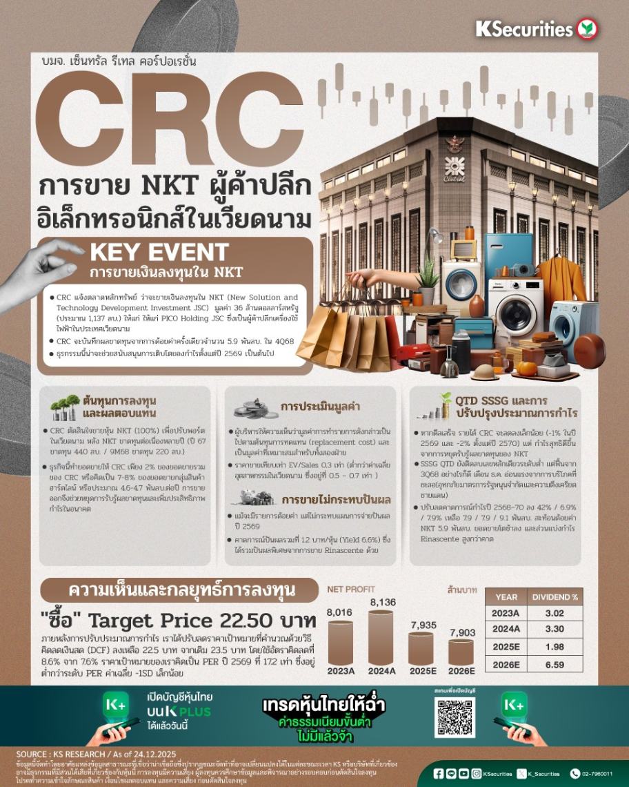 การขายเงินลงทุนใน NKT CRC แจ้งต่อตลาดหลักทรัพย์แห่งประเทศไทยเมื่อวันที่ 23 ธ.ค. 2568 ว่าบริษัทจะขายเงินลงทุนใน NKT New Solution and Technology Development Investment JSC (NKT) ให้แก่ PICO Holding JSC ซึ่งเป็นผู้ค้าปลีกเครื่องใช้ไฟฟ้าในประเทศเวียดนาม ด้วยมูลค่ากิจการ 36 ล้านดอลลาร์สหรัฐฯ (หรือประมาณ 1,137 ลบ.) CRC จะบันทึกผลขาดทุนจากการด้อยค่าครั้งเดียวประมาณ 5.9 พันลบ.ในไตรมาส 4/2568 เมื่อวัดเทียบกับมูลค่าตามบัญชีสุทธิของ NKT ที่ 6.0 พันลบ. คาดว่าธุรกรรมจะเสร็จสิ้นภายในหกเดือน และไม่ต้องขออนุมัติจากผู้ถือหุ้นเนื่องจากขนาดของรายการ
