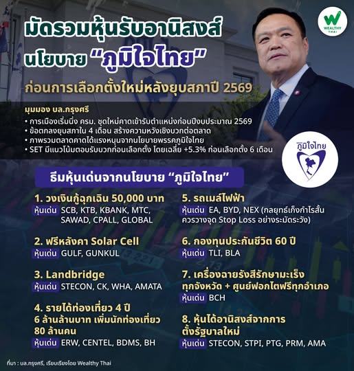 ขณะเดียวกัน นโยบายของพรรคภูมิใจไทยซึ่งยังมีบทบาทในการขับเคลื่อนรัฐบาลชุดปัจจุบัน กำลังกลายเป็นแรงหนุนสำคัญต่อความเชื่อมั่นของนักลงทุน โดยเฉพาะในกลุ่มหุ้นที่คาดว่าจะได้อานิสงส์จากมาตรการกระตุ้นเศรษฐกิจ พลังงานสะอาด และโครงสร้างพื้นฐาน ที่เริ่มถูกหยิบขึ้นมาเก็งกำไรก่อนเข้าสู่ฤดูเลือกตั้งอย่างเป็นทางการ