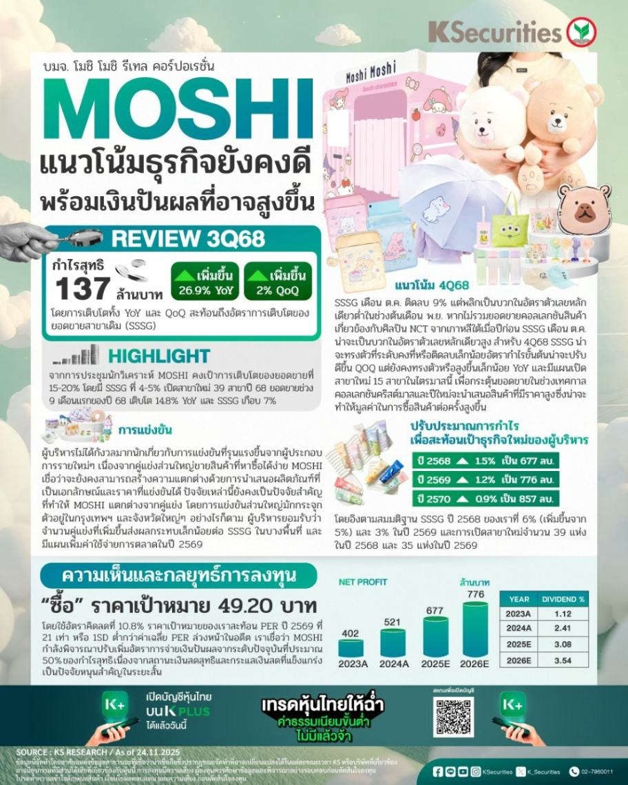MOSHI คงเป้าการเติบโตของยอดขายที่ 15-20% โดยมี SSSG ที่ 4-5% เปิดสาขาใหม่ 39 สาขาปี 68 ยอดขายช่วง 9 เดือนแรกของปี 68 เติบโต 14.8% YoY และ SSSG เกือบ 7%