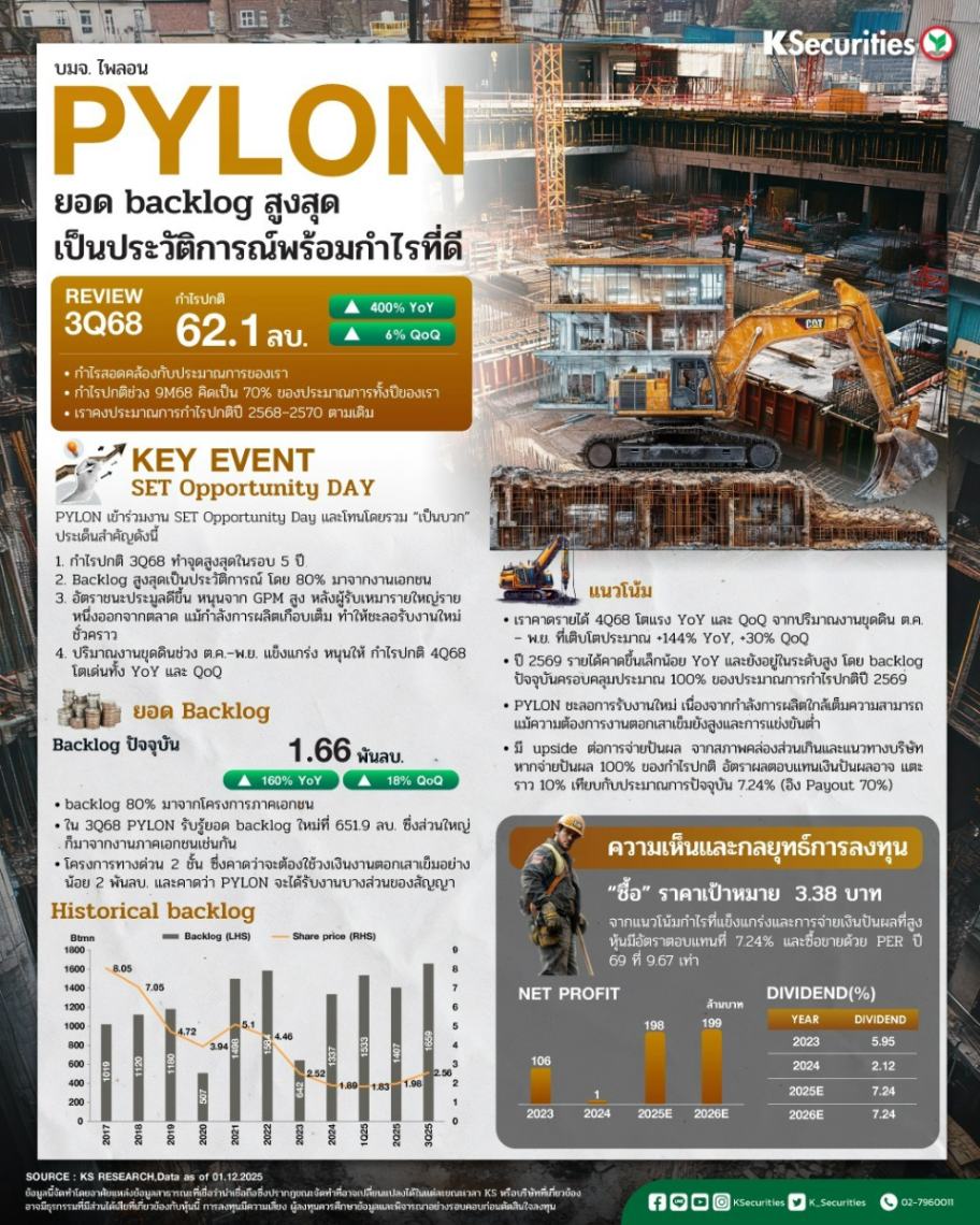 PYLON เข้าร่วมงาน SET Opportunity Day และโทนโดยรวมเป็นบวกจากรายได้ที่สูงสุดรอบ 5 ปี, ยอด backlog ที่สูงสุดเป็นประวัติการณ์และแนวโน้ม 4Q68 ที่แข็งแกร่งหนุนจากการแข่งขันในตลาดเจาะเสาเข็มที่รุนแรงน้อยลง