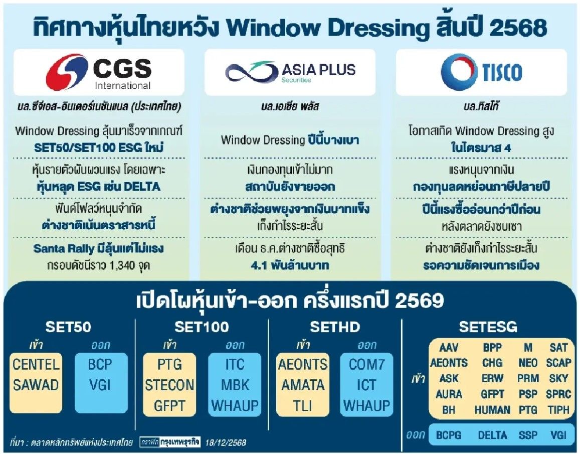 ตลาดหุ้นไทยช่วงโค้งสุดท้ายของปีเริ่มกลับมาถูกจับตาอีกครั้ง หลังนักวิเคราะห์หลายสำนักประเมินว่า มีโอกาสเกิดปรากฏการณ์ Window Dressing หรือการปรับพอร์ตการลงทุนของกองทุนค่อนข้างสูง จากการเปลี่ยนแปลงเกณฑ์สำคัญของตลาด ทั้งการคัดเลือกหุ้นเข้าออกดัชนี SET50/SET100 และเกณฑ์ ESG ใหม่ กระทบเงินลงทุนต่างชาติอาจเข้ามาอย่างจำกัด