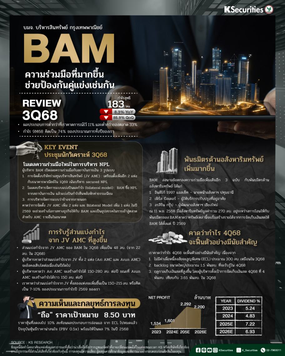 BAM เตรียมขยายความร่วมมือกับธนาคารโดยจัดตั้งบริษัทร่วมทุนบริหารสินทรัพย์ (JV AMC) เพิ่มอีก 2 แห่งในไตรมาส 1/69 และอีกแห่งคือโมเดลบริหารจัดการแบบแบ่งปันผลกำไรเพื่อเสริมสร้างอุปสรรคในการเข้าสู่ตลาด