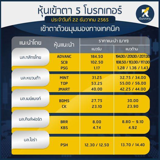 คัดสรร ‘หุ้นเข้าตา 5 โบรกเกอร์’ ด้วยสัญญาณทางเทคนิค ประจำวันที่ 22 ธ.ค. 65 จากบทวิเคราะห์ของ 5 โบรกเกอร์ชั้นนำ