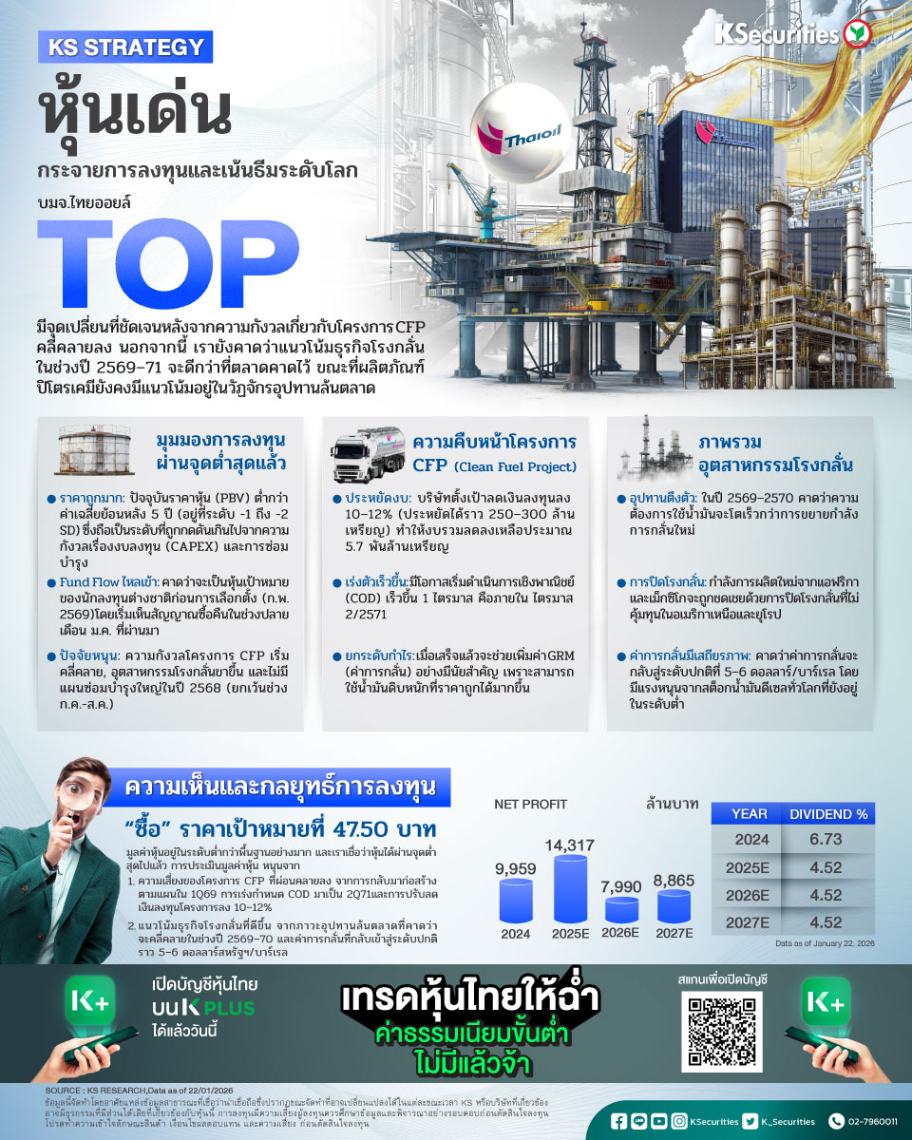 แนะนำ “ซื้อ” และ TP ที่ 47.50 บาท มูลค่าหุ้นอยู่ในระดับต่ำกว่าพื้นฐานอย่างมาก และเราเชื่อว่าหุ้นได้ผ่านจุดต่ำสุดไปแล้ว การประเมินมูลค่าใหม่ของมูลค่าหุ้นได้รับแรงสนับสนุนจาก 1) ความเสี่ยงของโครงการ CFP ที่ผ่อนคลายลง จากการกลับมาก่อสร้างตามแผนในไตรมาส 1/2569 การเร่งกำหนด COD มาเป็นไตรมาส 2/2571 และการปรับลดเงินลงทุนโครงการลง 10–12% และ 2) แนวโน้มธุรกิจโรงกลั่นที่ดีขึ้น จากภาวะอุปทานล้นตลาดที่คาดว่าจะคลี่คลายในช่วงปี 2569–70 และค่าการกลั่นที่กลับเข้าสู่ระดับปกติราว 5–6 ดอลลาร์สหรัฐฯ/บาร์เรล