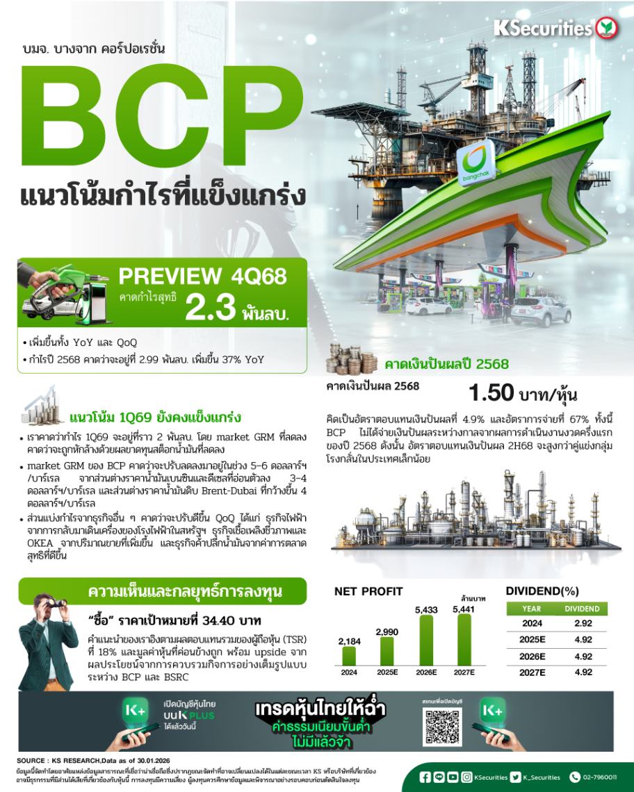 เราคาดว่ากำไรสุทธิไตรมาส 4/2568 ของ BCP จะอยู่ที่ 2.3 พันลบ. เติบโต 110% QoQ และดีขึ้นจากกำไรสุทธิที่ 17 ลบ. ในไตรมาส 4/2567 จากการปรับตัวดีขึ้นของธุรกิจโรงกลั่นและธุรกิจไฟฟ้า อันเป็นผลสืบเนื่องจาก market GRM ที่อยู่ในระดับสูงที่ 11.3 ดอลลาร์สหรัฐฯ/บาร์เรล เพิ่มขึ้นทั้ง YoY และ QoQ แม้จะมีโอกาสเกิดผลขาดทุนจากสต็อกน้ำมันประมาณ 3 พันลบ. (3.5 ดอลลาร์ฯ/บาร์เรล) รวมถึงยอดขายไฟฟ้าที่เพิ่มขึ้น 14% YoY และ 2% QoQ จากการเริ่มเดินเครื่องโครงการพลังงานลม Monsoon ขณะที่ผลการดำเนินงานของธุรกิจค้าปลีกน้ำมัน ธุรกิจเชื้อเพลิงชีวภาพ (BBGI) และธุรกิจทรัพยากรธรรมชาติ (OKEA) คาดว่าจะอ่อนตัวลง จากค่าการตลาดขายปลีกน้ำมันที่ลดลงและปริมาณขายที่น้อยลง ดังนั้น กำไรปี 2568 คาดว่าจะอยู่ที่ 2.99 พันลบ. เพิ่มขึ้น 37% YoY