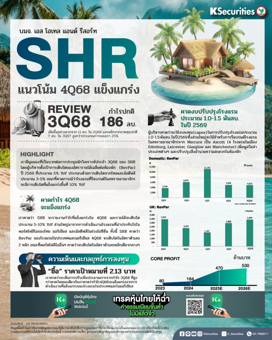 เราคาดว่า SHR จะรายงานกำไรที่แข็งแกร่งในไตรมาส 4/2568 และรายได้จะเติบโตประมาณ 5-10% YoY ส่วนใหญ่มาจากการดำเนินงานโรงแรมที่น่าประทับใจในพอร์ตโฟลิโอของไทย มอริเชียส และมัลดีฟส์ในช่วงไฮซีซั่น ทั้งนี้ SHR คาดว่า RevPar ของโรงแรมในประเทศและมอริเชียสไตรมาส 4/2568 จะเติบโตในอัตราตัวเลข 2 หลัก ขณะที่พอร์ตโฟลิโออื่นๆ คาดว่าจะเติบโตในอัตราตัวเลขหลักเดียวกลางๆ