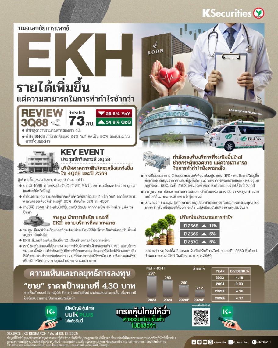 ผู้บริหารชี้แจงระหว่างการประชุมนักวิเคราะห์ประจำไตรมาส 3/2568 ในสัปดาห์ที่แล้วว่ารายได้ไตรมาส 4/2568 น่าจะทรงตัว QoQ (7-8% YoY) จากการเปลี่ยนแปลงของฤดูกาลของโรคไข้หวัดใหญ่ ขณะที่กำไรเฉพาะของ รพ.เอกชัยน่าจะเติบโตในอัตราตัวเลข 2 หลัก YoY จากอัตราการครอบครองเตียงที่น่าจะอยู่ที่ 80% เทียบกับ 62% ในไตรมาส 4/2567 และรายได้ปี 2569 น่าจะเติบโตดีขึ้นจากปี 2568 จากการเปิด รพ.ใหม่ 3 แห่ง ในปีหน้า