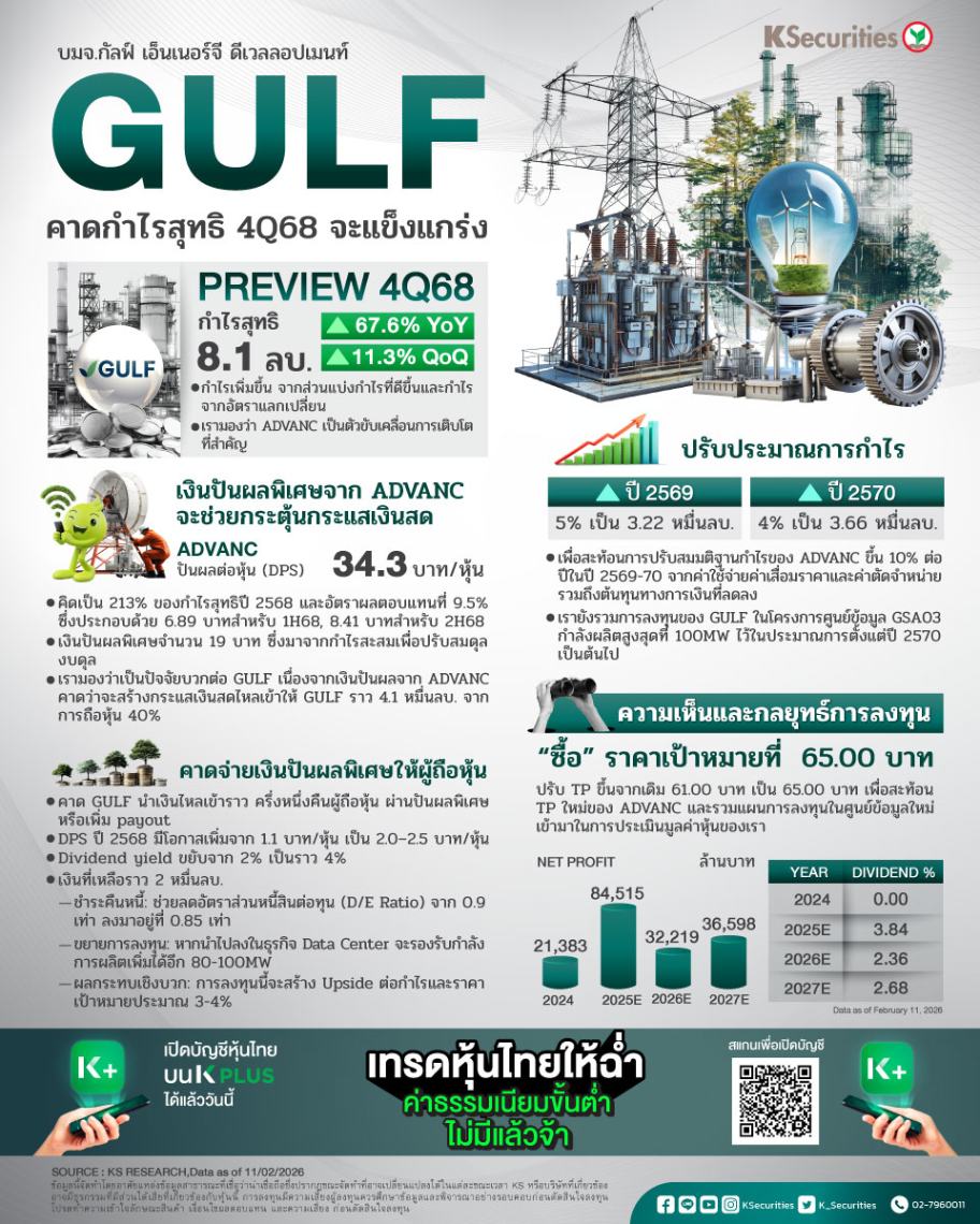 ADVANC ประกาศเงินปันผลต่อหุ้น (DPS) ทั้งปีที่ 34.3 บาท/หุ้น คิดเป็น 213% ของกำไรสุทธิปี 2568 และอัตราผลตอบแทนที่ 9.5% ซึ่งประกอบด้วย 6.89 บาทสำหรับครึ่งแรกของปี 2568, 8.41 บาทสำหรับครึ่งหลังของปี 2568 และเงินปันผลพิเศษจำนวน 19 บาท ซึ่งมาจากกำไรสะสมเพื่อปรับสมดุลงบดุล เรามองว่าเป็นปัจจัยบวกต่อ GULF เนื่องจากเงินปันผลจาก ADVANC คาดว่าจะสร้างกระแสเงินสดไหลเข้าให้ GULF ราว 4.1 หมื่นลบ. จากการถือหุ้น 40%